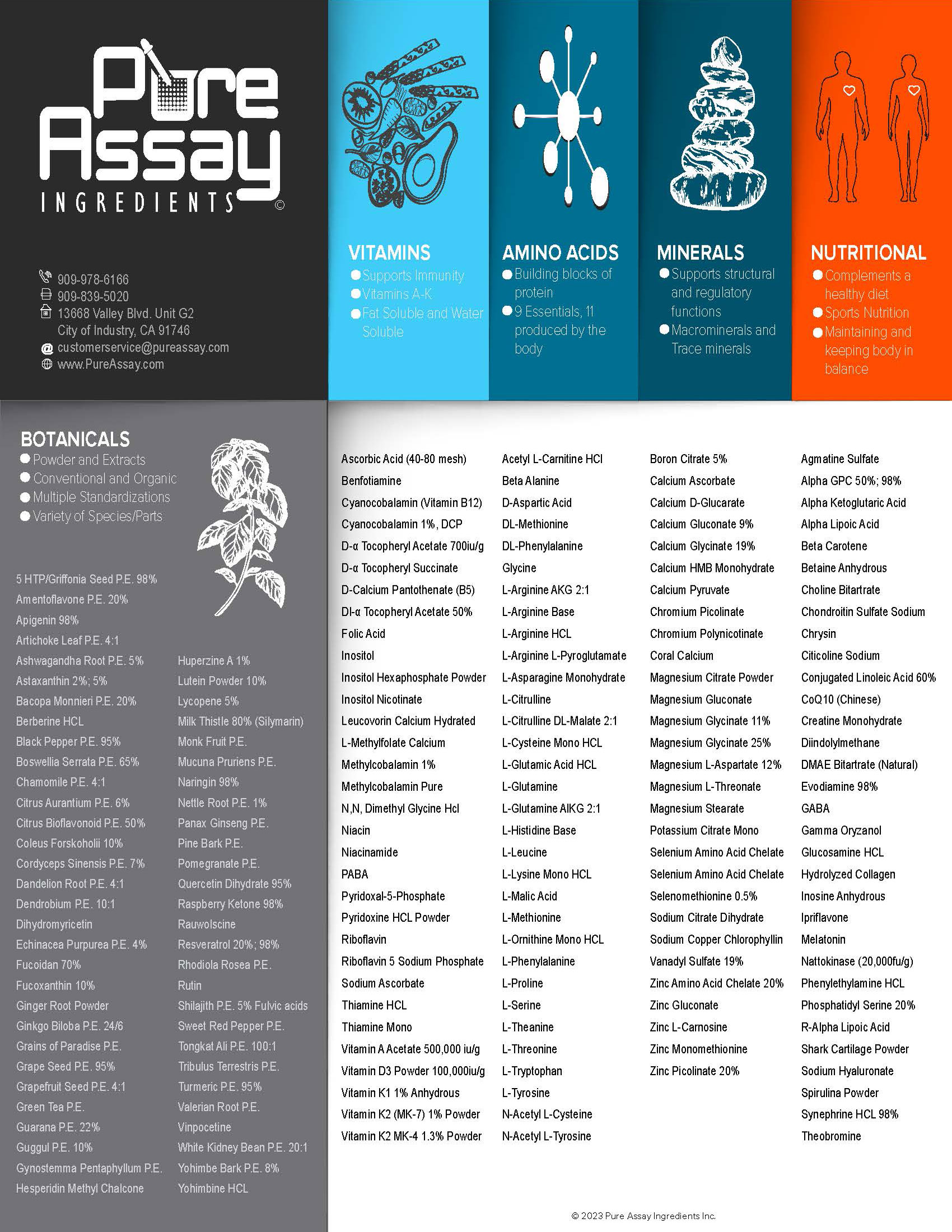 Pure Assay distributes an array of ingredients including nutritional supplements, vitamins, amino acids, botanical, minerals and other specialties. Our products play a vital role in the formulation and production of finished products, spanning several industries from food to animal nutrition to personal care.